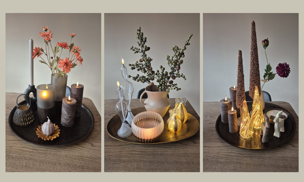 Tip: Kies één groot dienblad of plateau als basis en vul dit aan met je favoriete windlichten, LED kaarsen, vaasjes en zijden bloemen. Zo creëer je een tijdloos en sfeervol hoekje dat met een kleine aanpassing steeds weer nieuw aanvoelt.