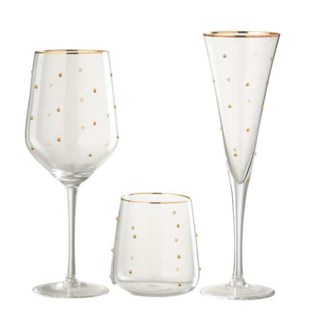 Stijlvol champagneglas met gouden stippen, perfect voor een luxe en feestelijke tafeldecoratie. Dit elegante glas is ideaal voor mousserende wijnen en laat zich mooi combineren met ons wijnglas en drinkglas voor een complete glazen set. Voeg een sprankelend en glamoureus accent toe aan je diner, borrel of feestavond.