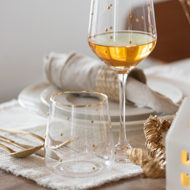 Deze drinkglazen met gouden stippen geven elke tafel een stijlvolle en speelse uitstraling. Het transparante glas met subtiele gouden details maakt ze geschikt voor zowel dagelijks gebruik als speciale momenten. Ze zijn perfect voor water, frisdrank of een feestelijk drankje en leuk te combineren met bijpassende wijn- en champagneglazen voor een mooi geheel op tafel.