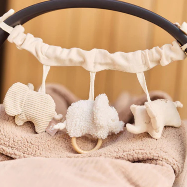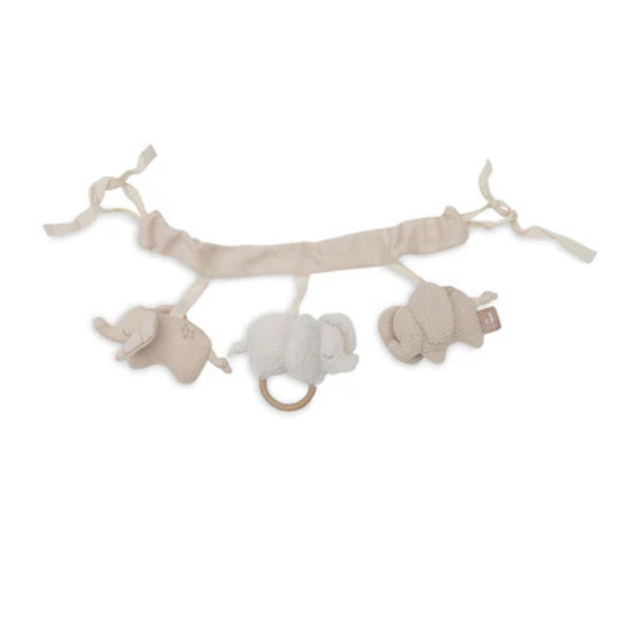 Deze vrolijke wagenspanner is versierd met drie schattige olifantjes, elk met een uniek ontwerp. Er is een velours olifant in wit, een olifant van ribstof, en een effen olifantje met schattige ruit patroon oren. De olifantjes zijn met elkaar verbonden en kunnen gemakkelijk aan de kinderwagen bevestigd worden. Ideaal voor onderweg!