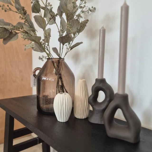 Deze kleinere kandelaar in donkerbruine tint heeft een organisch en sculpturaal design met zachte, vloeiende vormen. De natuurlijke uitstraling maakt hem perfect om subtiel sfeer toe te voegen aan je interieur. Mooi op tafel, dressoir of in een open kast en leuk te combineren met de grotere variant voor een stijlvol en speels geheel.