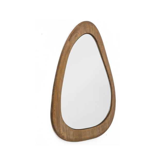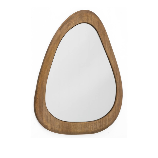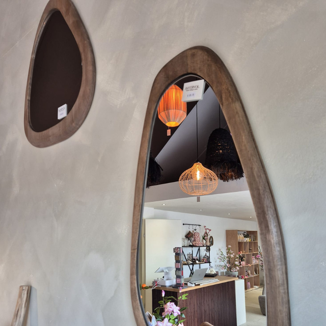Voeg een vleugje Japandi-stijl toe aan je interieur met onze organisch gevormde wandspiegel. Met een prachtige houten lijst brengt deze spiegel eenvoudige elegantie in elke kamer. De afmetingen van de walnoot houten spiegel zijn 45x54,5cm.