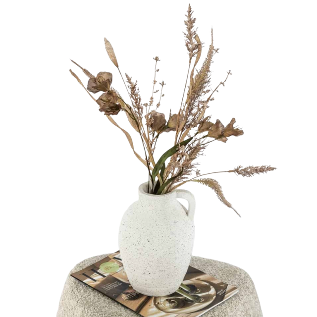 Deze stenen vaas is ideaal te vullen met een mooi boeket droogbloemen of een paar stijlvolle zijden bloemen. Dankzij de neutrale witte kleur met donkere details past de vaas in vrijwel iedere woonstijl van modern tot landelijk.