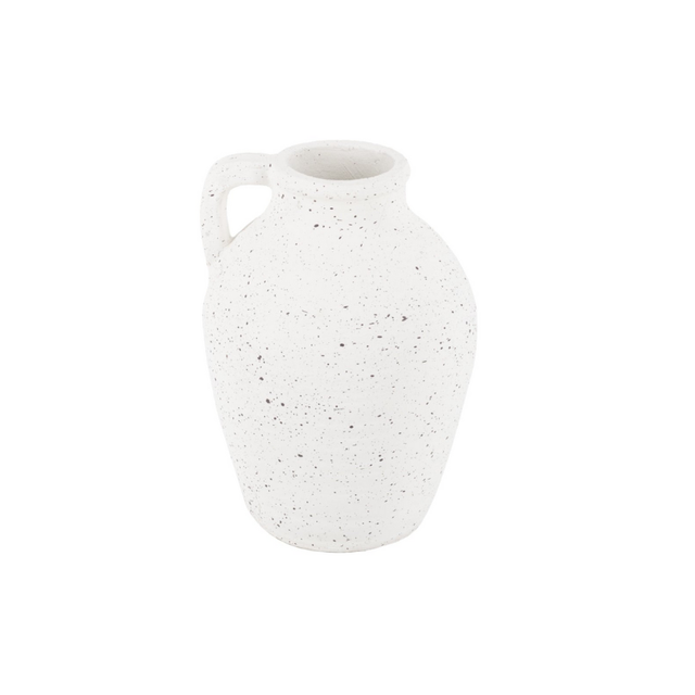 Deze witte stenen vaas met oor is een echte blikvanger in je interieur. Het unieke ontwerp wordt versterkt door de subtiele donkere spikkels, die zorgen voor een speels en eigentijds effect. Zo combineert de vaas moeiteloos elegantie met een moderne, robuuste uitstraling.