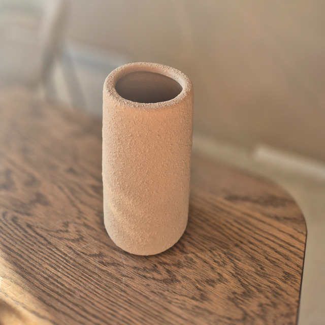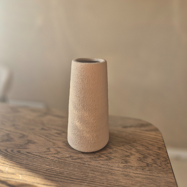 Deze stenen vaas in de kleur beige is geschikt voor zijdenbloemen of droogbloemen